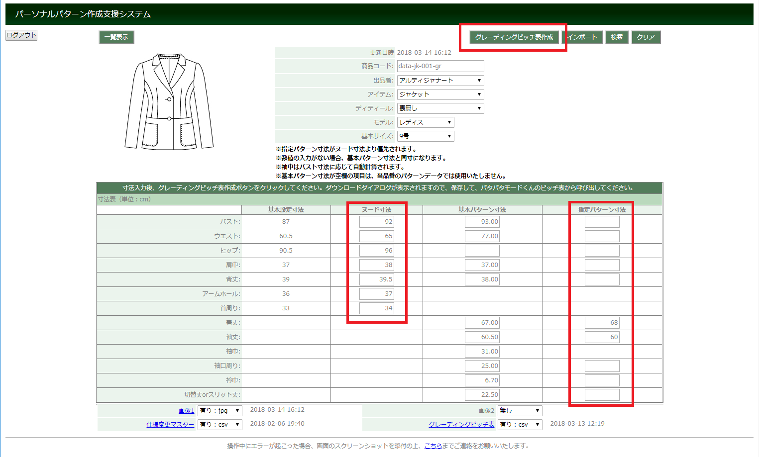 - ヌード寸法欄に、採寸値を入力してください。