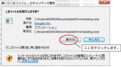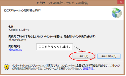 実行 をクリックします。実行すると、デスクトップ画面下のアンダーバーにグーグルのアイコンが表示されます。