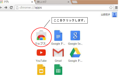 アプリをクリックしましたが、リモートデスクトップが画面に無いのでダウンロードします。「ウエブストア」をクリックします。