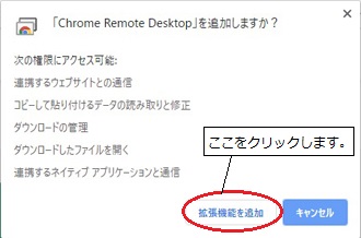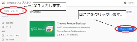 画面左の検索欄に「chrome リモート」と入力すると、画面右にChrome Remote Desktopが表示されます。「chromeに追加」をクリックします。